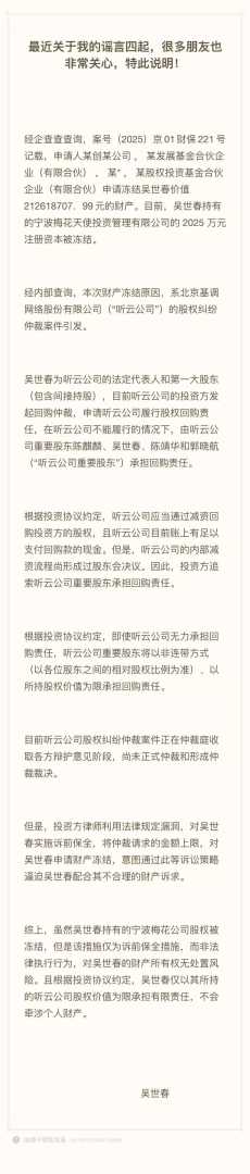 梅花创投创始合伙人吴世春回应名下超2亿元资产遭冻结,称正在和解沟通,不存在转移资产情况,系听云公司股权纠纷仲裁案件引发。