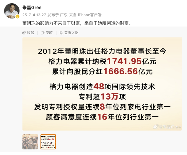 7月4日,格力电器市场总监朱磊发布微博称,董明珠的影响力不来自于财富,而是来自于她所创造的巨大财富。