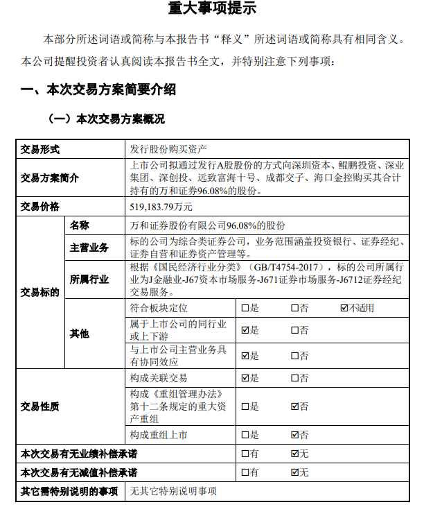 国信证券于12月6日正式发布公告,计划通过发行A股股份的方式,向包括深圳市资本运营集团有限公司、深圳市鲲鹏股权投资有限公司、深业集团有限公司、深圳市创新投资集团有限公司、深圳远致富海十号投资企业、成都交子金融控股集团有限公司以及海口市金融控股集团有限公司在内的多家公司,收购其合计持有的万和证券96.08%的股份。此次交易的总金额高达51.92亿元。