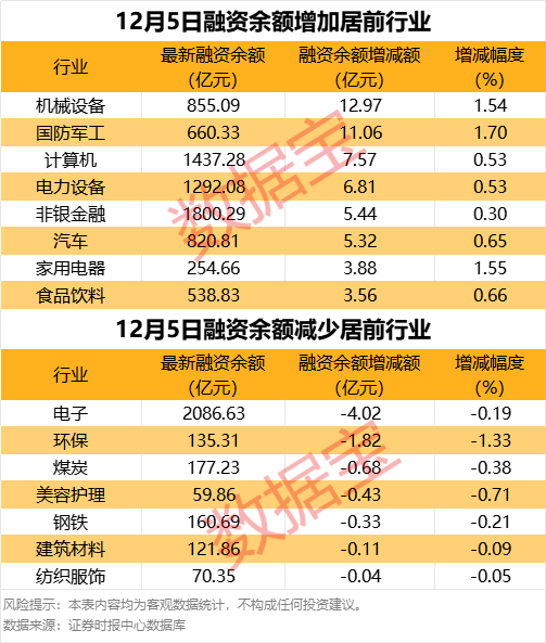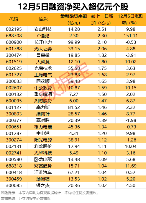 具体到个股,12月5日共有2030只股票获得融资净买入,其中净买入金额超过千万元的达到460只,更有25只股票的融资净买入额超过1亿元。岩山科技以2.51亿元的净买入额位居首位,C佳驰、长江电力紧随其后,净买入金额分别为2.30亿元、2.10亿元。此外,光大证券、景嘉微、大智慧等股票的净买入额也位居前列。