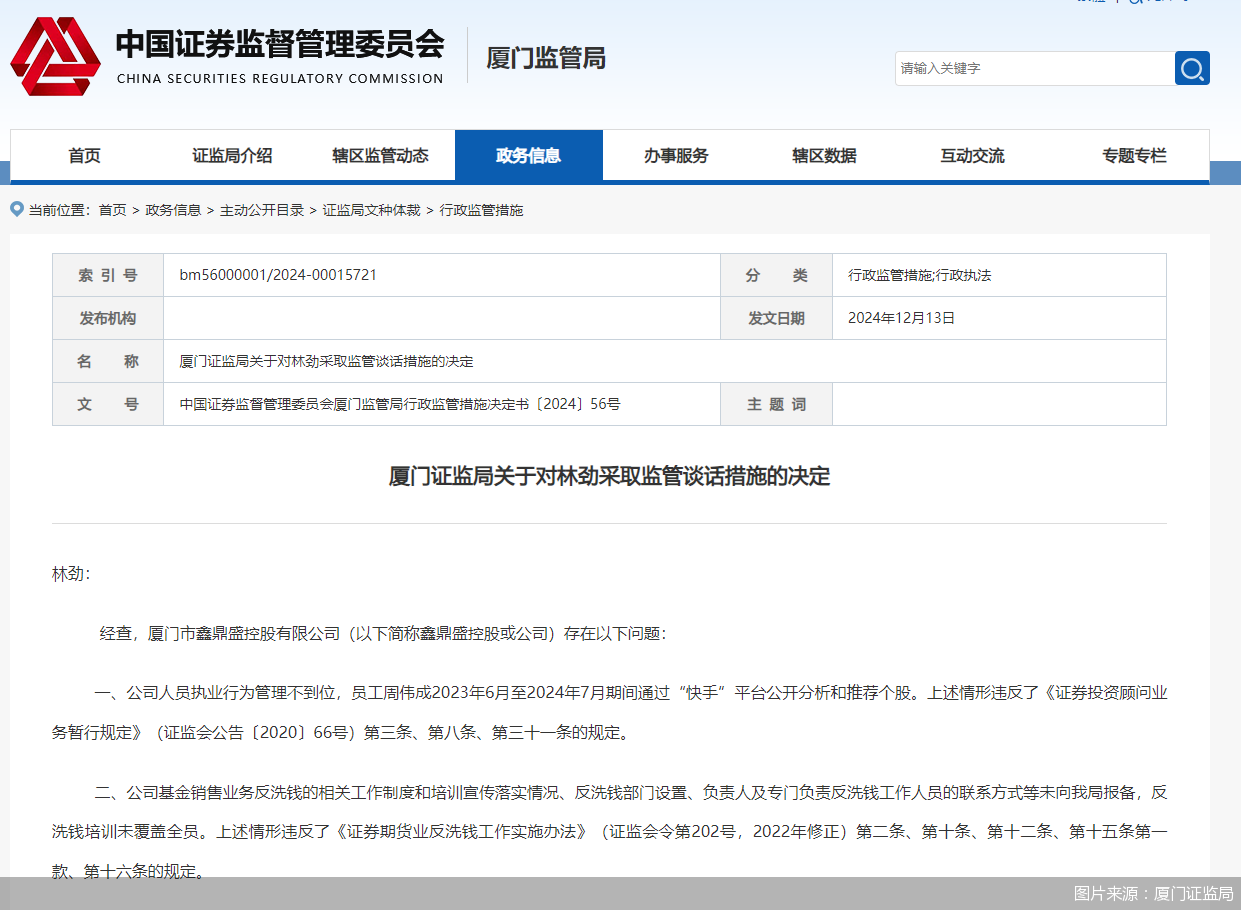 北京商报讯(记者郝彦)近日,厦门证监局针对厦门市鑫鼎盛控股有限公司(简称“鑫鼎盛控股”)发布了一则监管公告。公告指出,鑫鼎盛控股存在人员执业行为管理不严的问题,具体为员工周伟成在2023年6月至2024年7月期间,未经授权通过“快手”平台擅自公开分析和推荐个股,此行为违反了相关证券法律法规。