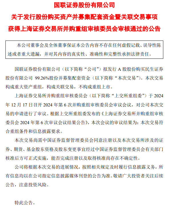 据悉,上海证券交易所并购重组审核委员会已于12月17日召开了相关审议会议,对国联证券此次交易的申请进行了全面而细致的审议。经过严格的审核流程,审议结果最终出炉:此次交易不仅完全符合重组的各项条件,而且在信息披露方面也达到了规定的要求。