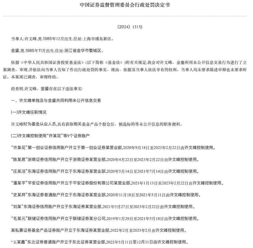此外,许文峰还多次明示、暗示他人利用未公开信息交易,导致相关人员控制的3个证券账户与相关基金产品产生趋同交易,并从中盈利3.82万元。