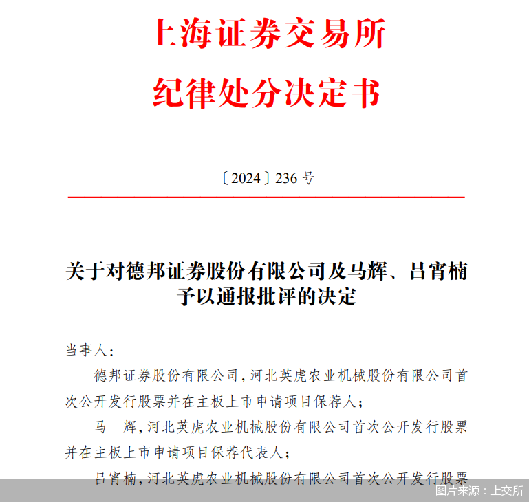 上交所发布通报批评决定,指出德邦证券及其保荐代表人马辉、吕宵楠在河北英虎农业机械股份有限公司首次公开发行股票并在主板上市申请项目中,存在多项保荐职责履行不到位的情形,包括未充分核查发行人会计基础工作规范性等。