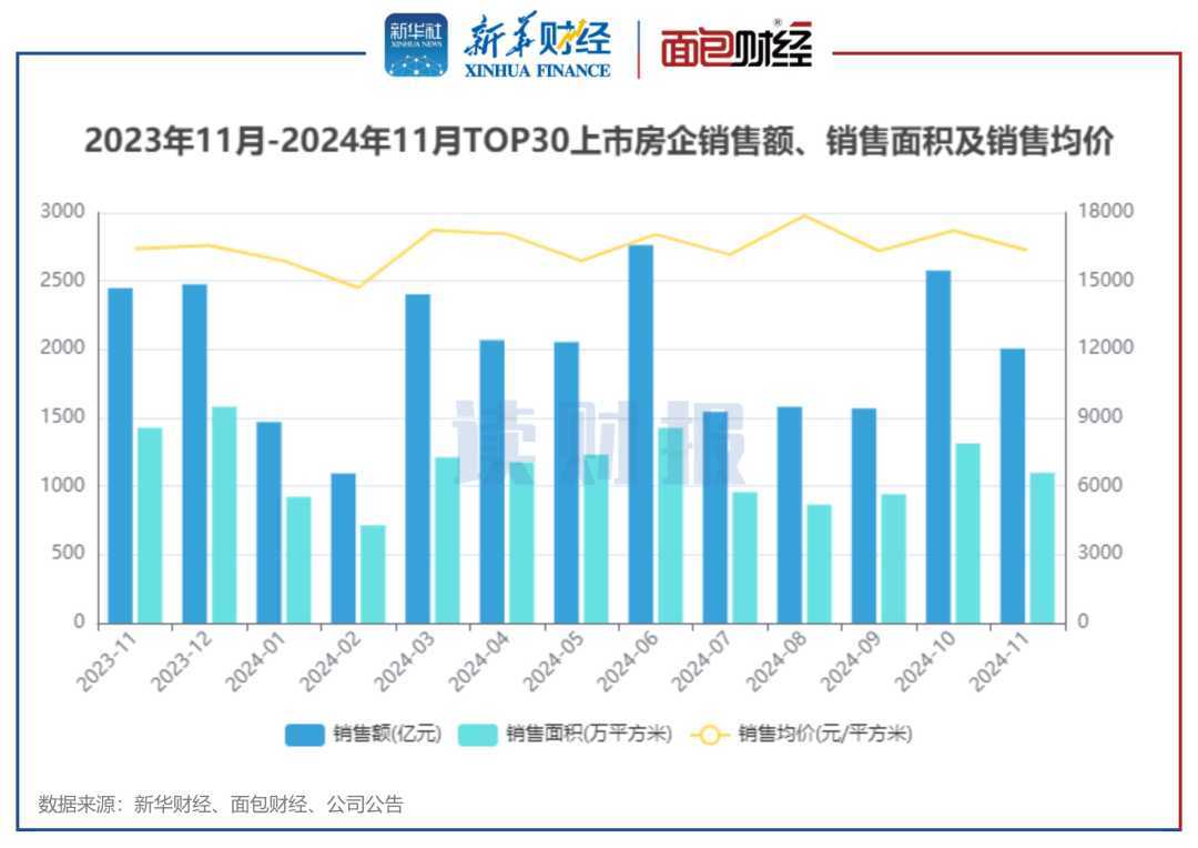 图1:2023年11月至2024年11月,TOP30上市房企在销售额、销售面积及销售均价方面的表现