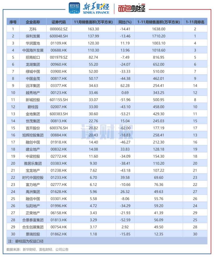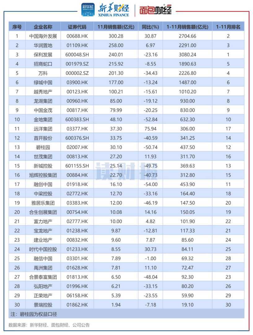 新华财经北京12月23日电 主流上市房企2024年11月的销售业绩已全面揭晓。新华财经与面包财经研究员联合分析,筛选沪、深、港三地交易所上市房企,剔除数据不全者,针对销售金额、销售面积及销售均价,分别统计并排名了前三十强企业。