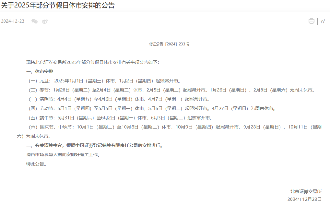 2025年交易所休市安排已正式公布。
