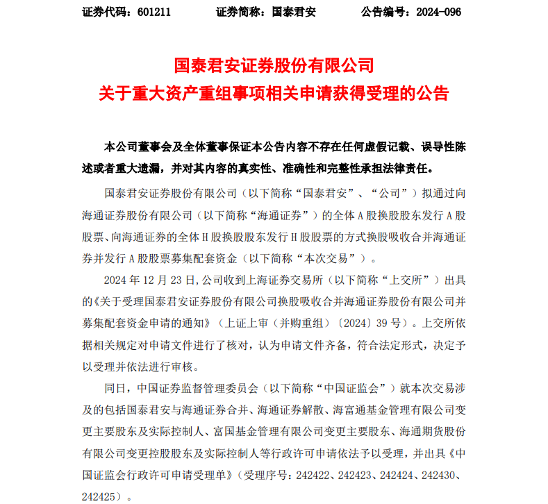 12月23日晚间,国泰君安证券与海通证券同步发布重要公告,宣布其合并重组申请已正式被中国证监会及上海证券交易所受理,标志着两家券商的合并进入监管审核新阶段。