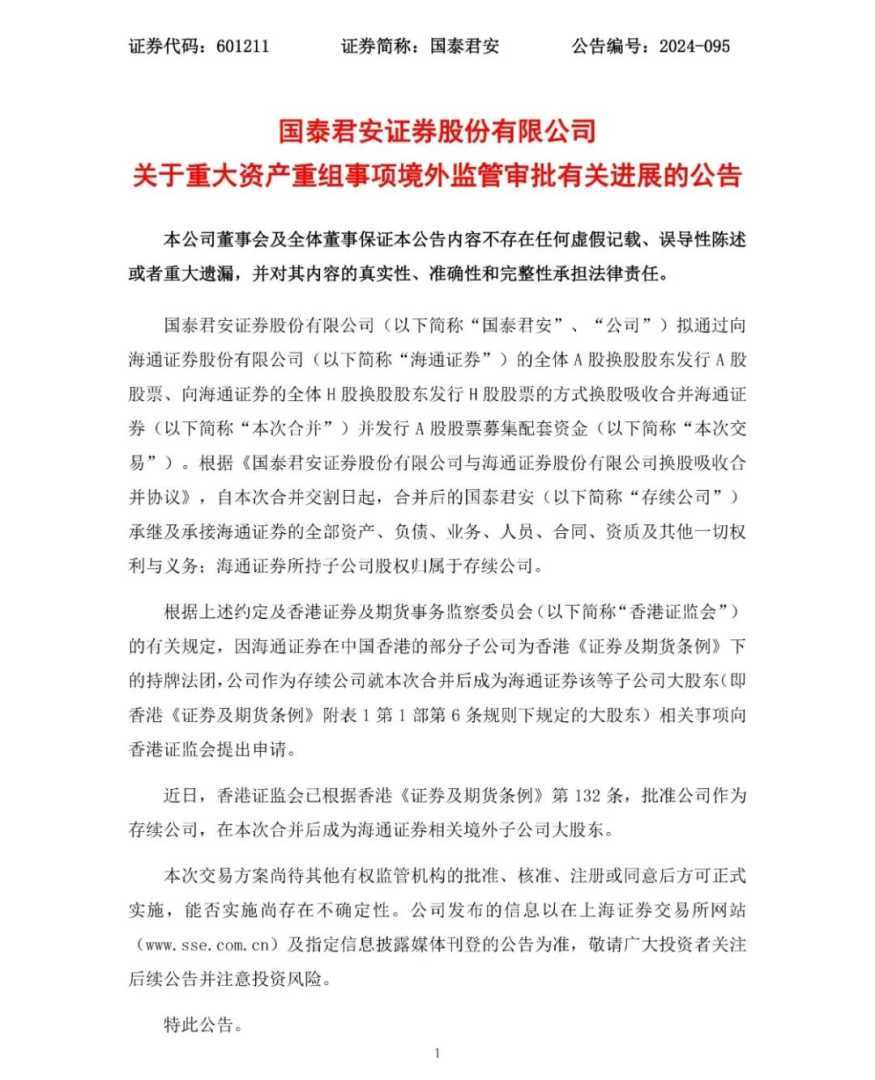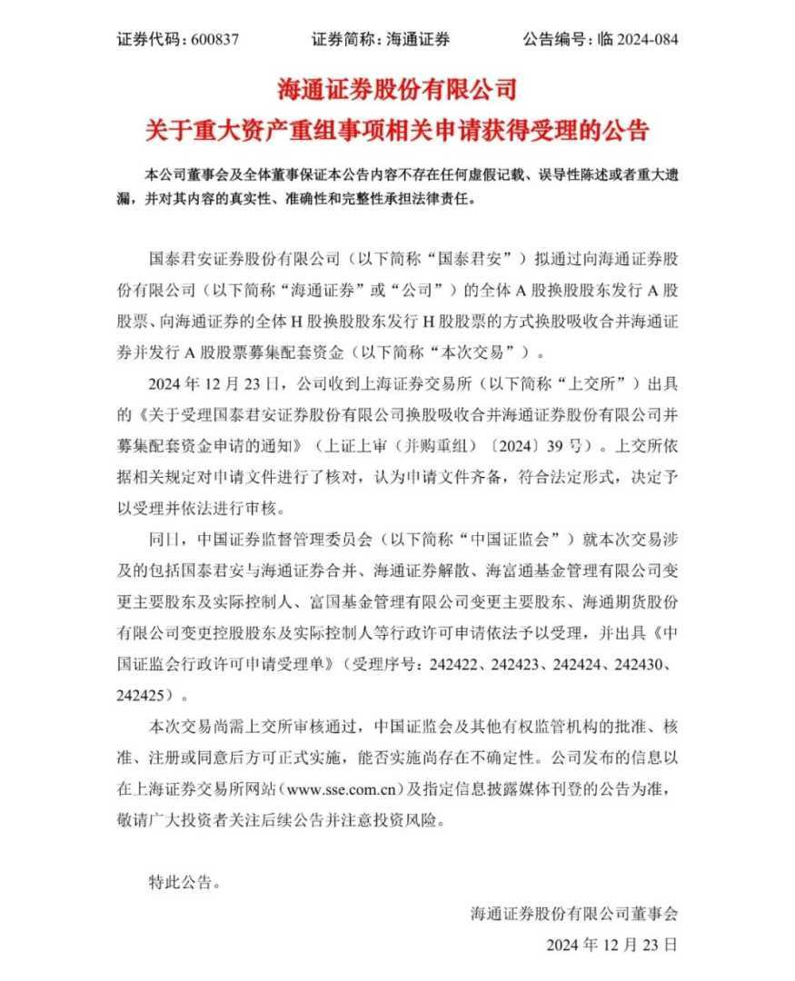 12月23日晚间,国泰君安与海通证券联合发布公告,宣布合并重组申请正式获得中国证监会及上海证券交易所受理,标志着合并进程迈出了关键一步。