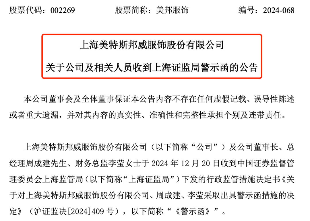 12月24日晚间,知名服饰品牌美邦服饰发布公告,披露公司及董事长、总经理周成建、财务总监李莹因2023年年报中投资性房地产确认不准确,于12月20日收到上海证监局下发的警示函。同时,深交所也向美邦服饰下发了监管函。