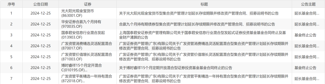 12月25日,广发证券资管宣布旗下3只、华安证券资管和光大证券资管各1只“参公”大集合产品延长存续期。与此同时,国泰君安资管则选择了清算其国泰君安信息行业混合发起产品。