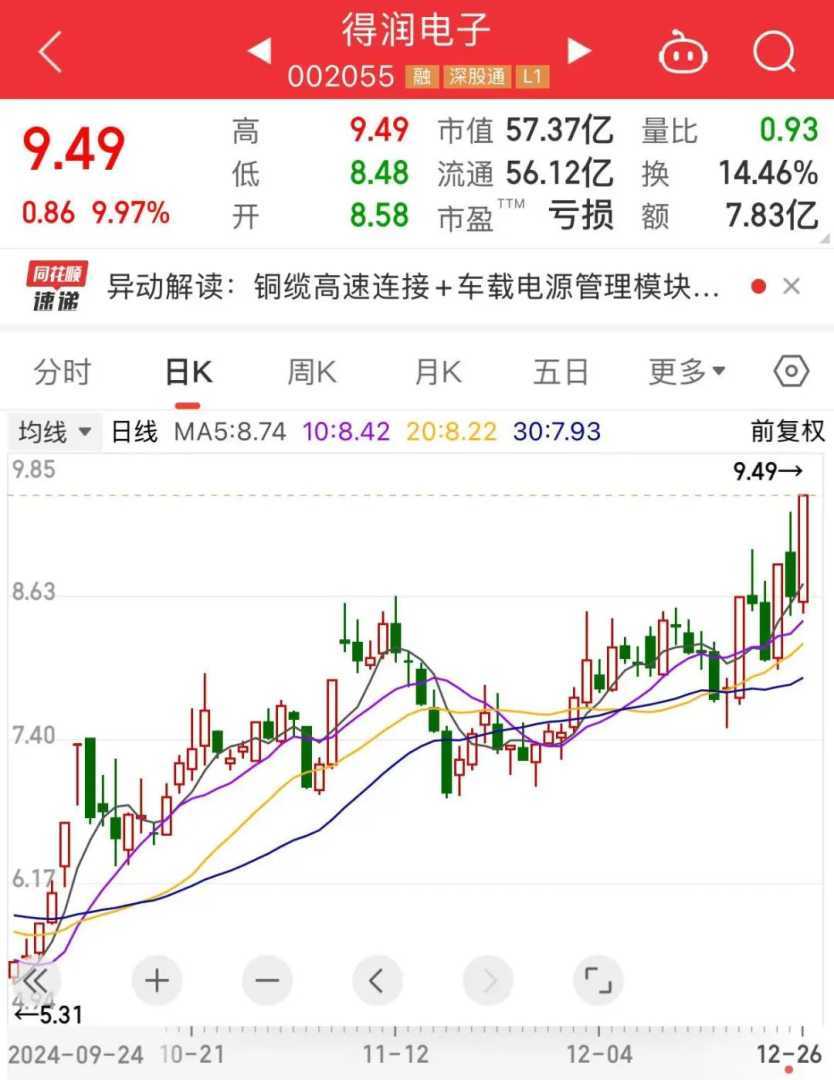 值得注意的是,在铜缆高速连接板块持续火热的背景下,得润电子股价近期持续攀升。自12月以来,公司股价累计上涨27.21%,并在昨日以涨停收盘,最新股价报9.49元/股。这表明市场对公司未来发展前景仍持乐观态度。