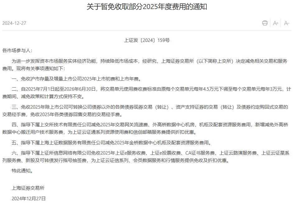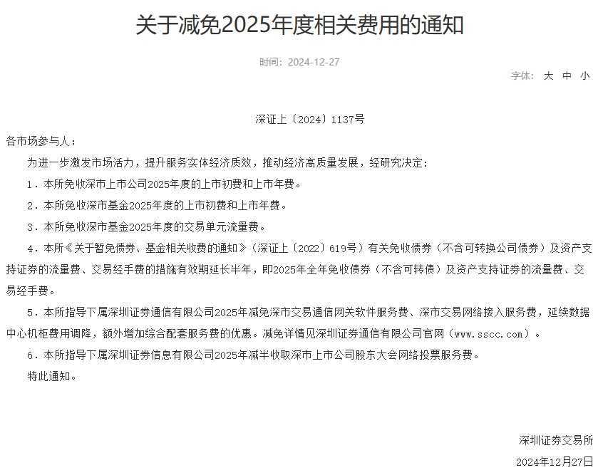 12月27日,上海证券交易所(上交所)与深圳证券交易所(深交所)同步发布重要通知,宣布将免收沪深两市上市公司2025年度的上市初费和上市年费等多项费用,旨在进一步优化市场环境,减轻企业负担。