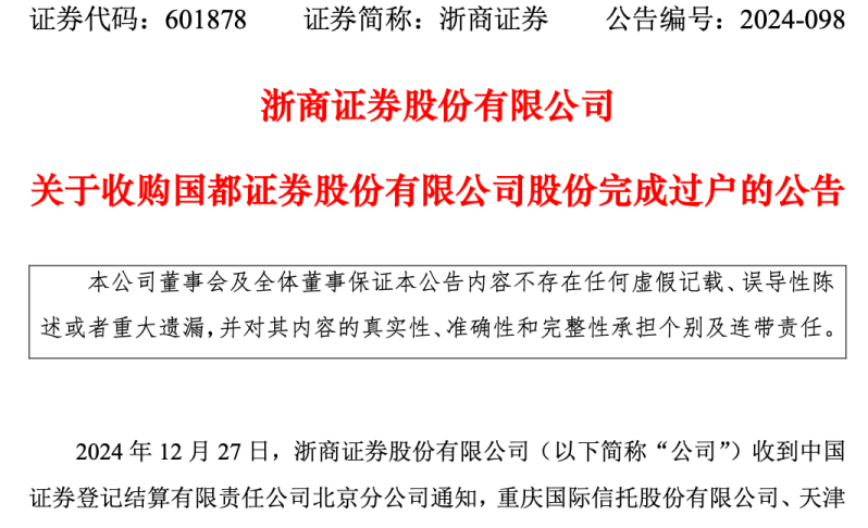 根据公告,浙商证券于12月27日收到中国结算北京分公司通知,确认由重庆信托等8名转让方合计持有的19.97亿股国都证券股份已完成过户登记。至此,浙商证券持有国都证券总股本34.25%的股份,超越中诚信托成为新一任单一大股东。