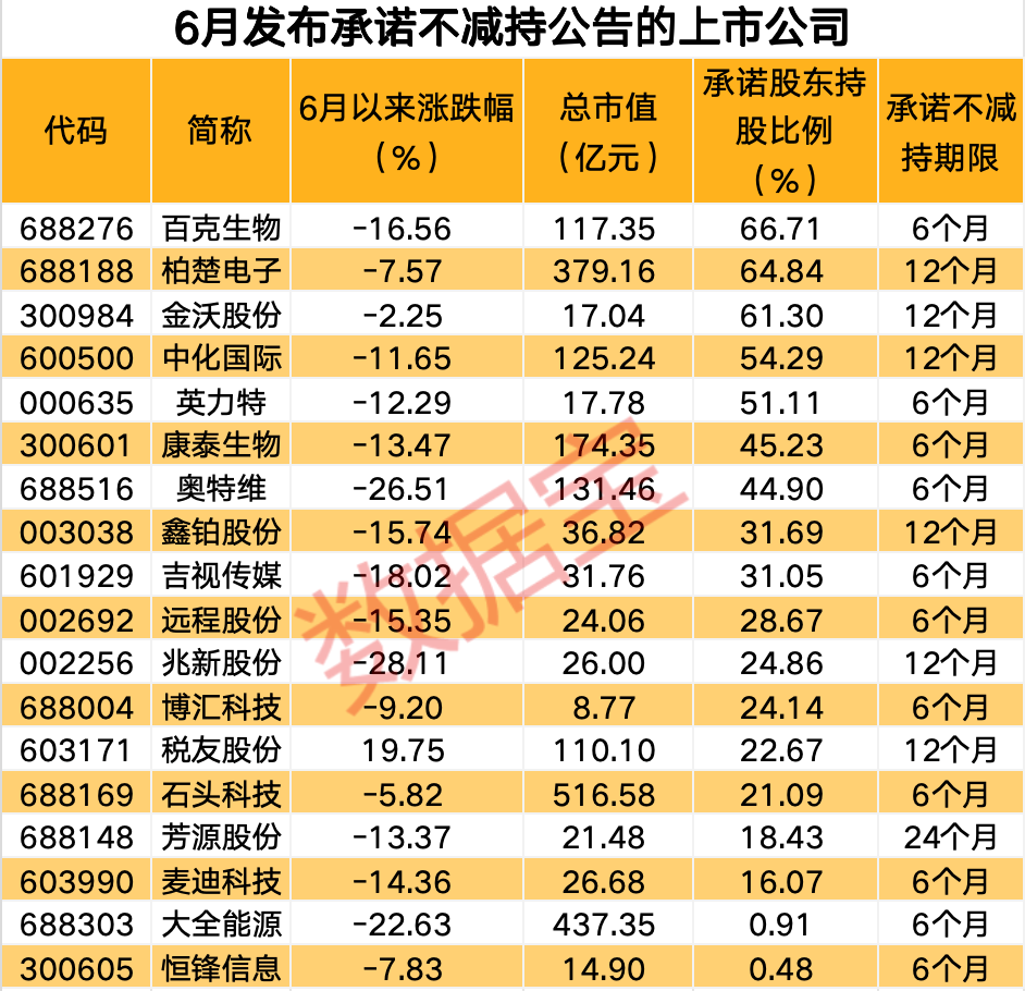 其中,18家上市公司控股股东发布公告,承诺在一定期限内不减持自家公司股份,这一举措在6月市场震荡下行的背景下显得尤为重要。石头科技、大全能源等行业龙头公司均位列其中。