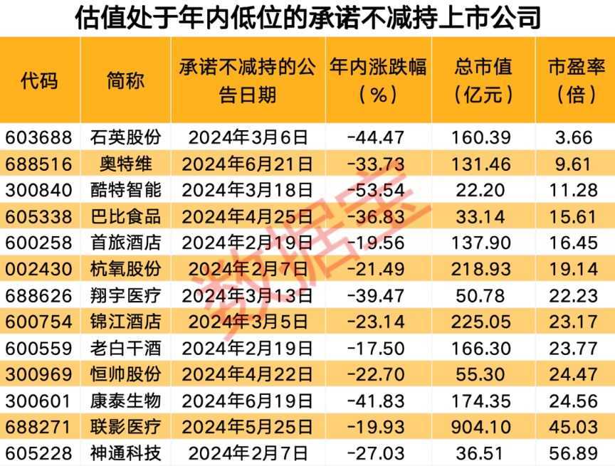 此外,据统计,今年以来发布承诺不减持公告的上市公司总市值合计达到1.19万亿元。但承诺不减持的上市公司年内普遍回调,平均下跌22.88%。其中,石英股份、奥特维、酷特智能等13股最新滚动市盈率创年内新低,展现出一定的投资价值。