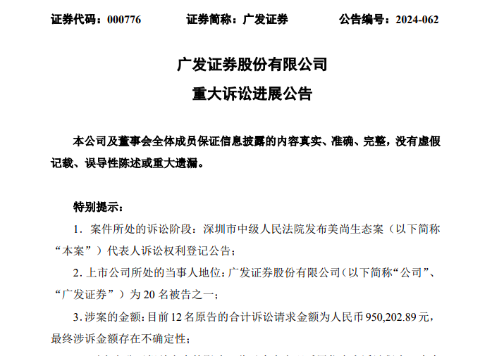 在美尚生态案中,广发证券和东兴证券被指与美尚生态财务造假有关,面临12名原告的诉讼请求,金额共计95.02万元。深圳中院已决定适用普通代表人诉讼程序审理此案,符合条件的投资者需在2025年1月27日前登记加入本案诉讼。美尚生态因在2012年至2020年6月期间合计虚增净利润4.57亿元,导致相关文件存在虚假记载。