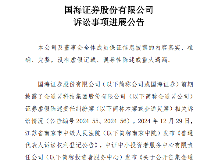 12月30日晚间,广发证券、东兴证券、光大证券、国海证券、华西证券五家券商同日披露了关于美尚生态和金通灵证券虚假陈述责任纠纷案的最新进展,投资者服务中心公开征集投资者参与普通代表人诉讼,并计划转换为特别代表人诉讼。