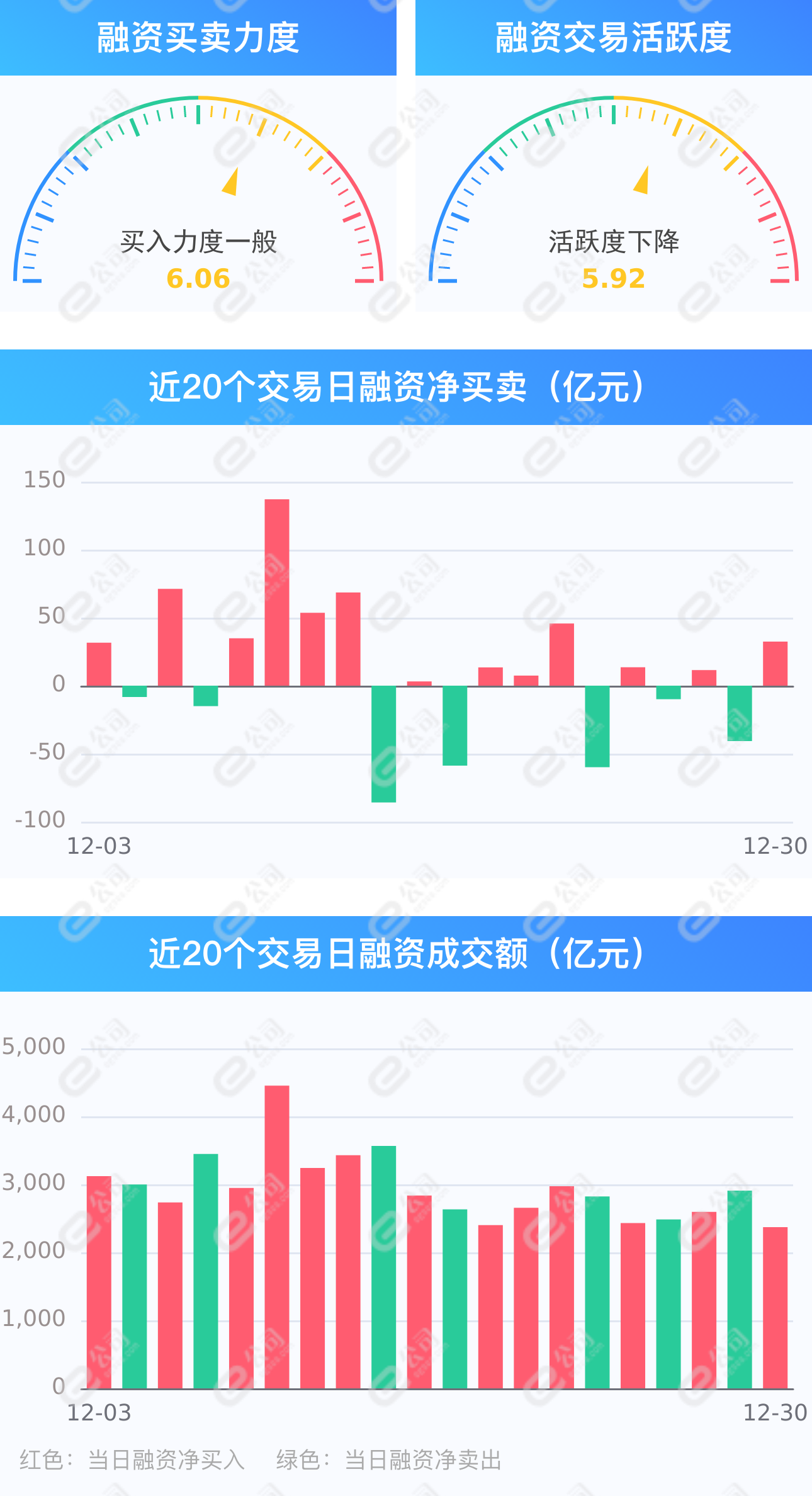 截至12月30日,沪深交易所融资余额均有所增加,合计达到18657.92亿元,环比增长32.37亿元。尽管融资交易总额较高,但市场交易活跃度却下降了18.50%。