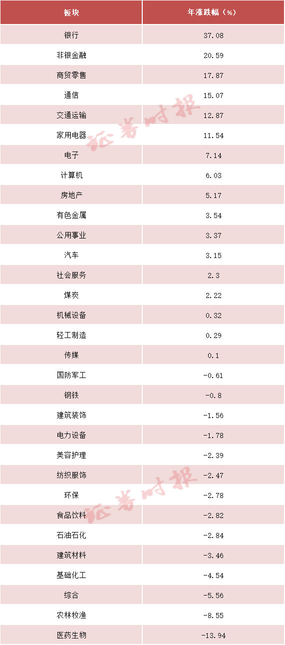 银行板块表现最为抢眼,年度涨幅高达37.08%,国有大行如工商银行、建设银行等屡创历史新高。非银金融板块表现次之,年度涨幅为20.59%,东方财富、中国人保等多只个股年度涨幅超50%。商贸零售、通信、交通运输、家用电器等板块年度涨幅亦超过10%,而电子、计算机、房地产等板块涨幅在5%以上。