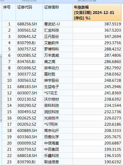 个股层面,自9月24日市场反弹以来,年度涨幅超100%的股票多达94只。其中,寒武纪以387%的涨幅夺得年度“涨幅王”称号,汇金科技、正丹股份紧随其后。