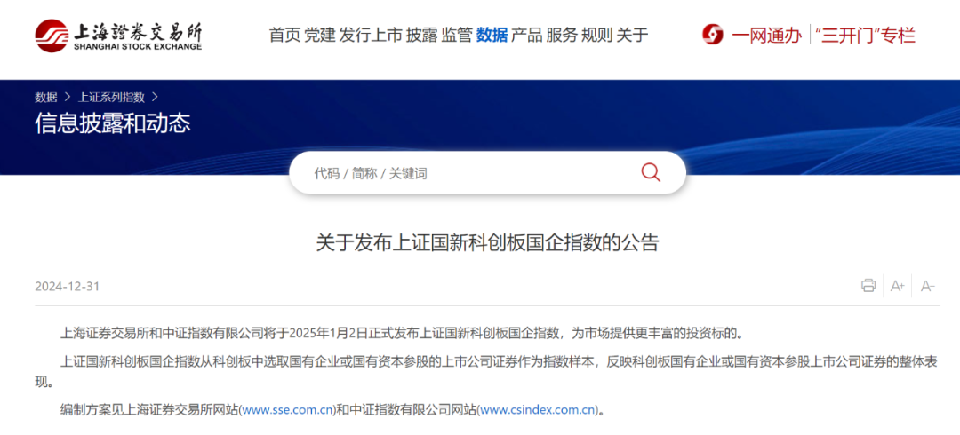 2024年12月31日,上交所携手中证指数有限公司,正式公告将于2025年1月2日隆重推出上证国新科创板国企指数,此举旨在拓宽市场投资渠道,为投资者提供更多元化的投资选择。