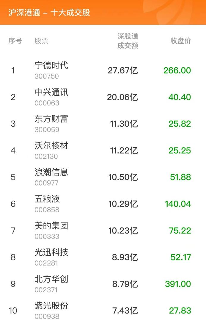 交易所公布的沪深港通十大成交股榜单中,贵州茅台、中信证券、兆易创新分别位居沪股通前三甲,其成交额分别为16.54亿元、13.23亿元和11.19亿元。而在深股通方面,宁德时代、中兴通讯、东方财富则位列前三,成交额分别达到27.67亿元、20.06亿元和11.30亿元。
