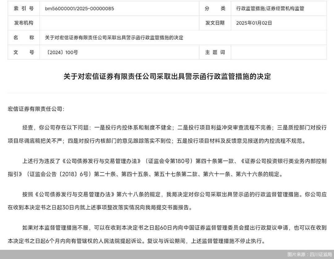 四川证监局公告指出宏信证券投行内控体系和制度不健全,存在多项问题,决定对其采取出具警示函的行政监督管理措施。