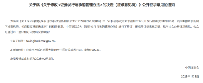 时间追溯至2024年6月19日,证监会发布了《关于深化科创板改革服务科技创新和新质生产力发展的八条措施》,提出将在科创板试点对未盈利企业公开发行股票锁定比例更高、锁定期限更长的网下投资机构,并相应提高其配售比例。为落实这一政策,今年1月3日,证监会表示将修改《证券发行与承销管理办法》,授权证券交易所制定分类配售的具体要求,并公开征求意见。