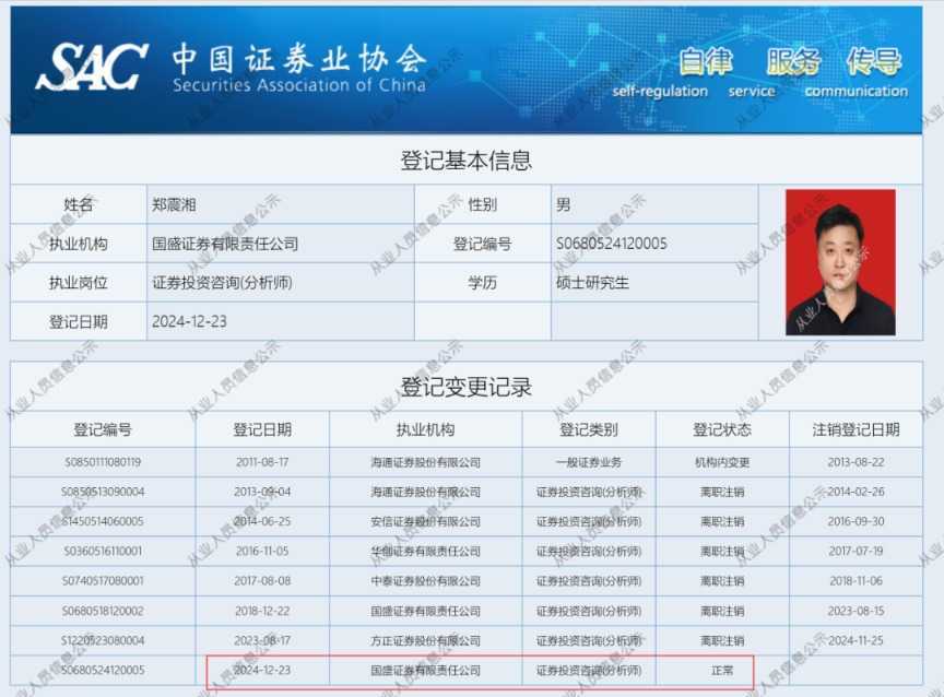 近日,原方正证券联席所长郑震湘再度回归国盛证券,担任国盛证券研究所联席所长一职。这一消息已在中国证券业协会官网公布。
