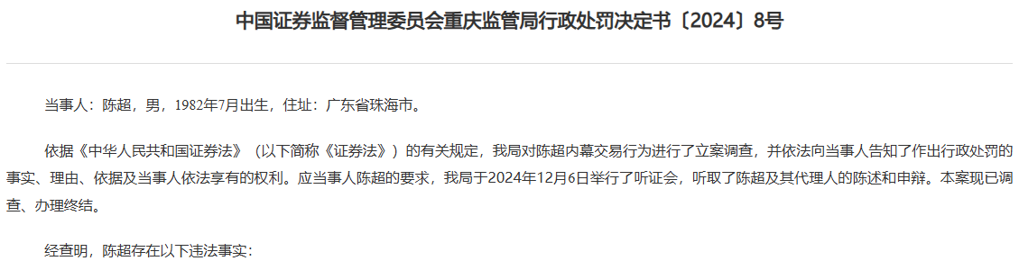 1月8日最新消息,重庆证监局近日披露的行政处罚决定书揭示了一桩内幕交易案。涉案者为1982年出生的食堂承包商陈超,他因内幕交易“鑫科材料”股票等违法行为,被处以没收及罚款共计1186.36万元。