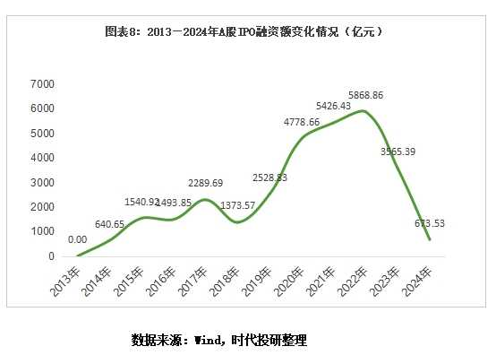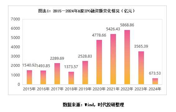 回顾历史,时代投研深入剖析了2024年IPO市场的融资全貌,揭示了其背后的变化趋势。数据显示,2024年A股IPO融资金额仅为673.53亿元,同比大幅下降81.11%,为十年来首次跌破千亿元大关。同时,新股发行数量也创下新低,仅有100只新股上市,同比锐减68.05%。