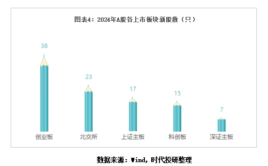 从上市板块来看,2024年A股各板块的IPO融资额均同比大幅下滑,其中创业板以225.81亿元的融资额位居榜首,上证主板次之,北交所垫底。而从新股数量来看,创业板以38只新股拔得头筹,北交所、上证主板、科创板的新股数量紧随其后。