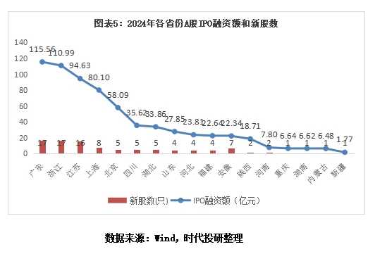 在区域方面,2024年全国仅有17个省份有A股IPO融资记录,较2023年大幅减少。其中,广东以115.56亿元的融资额位居榜首,浙江、江苏紧随其后。从新股数量来看,广东、浙江均以17只新股并列第一。