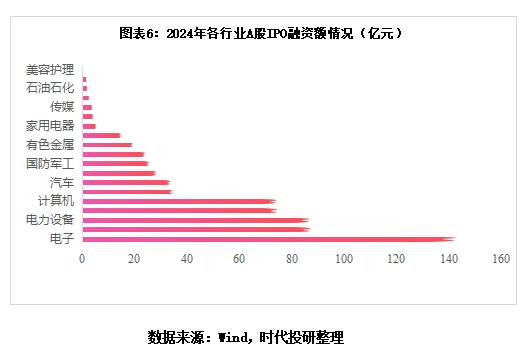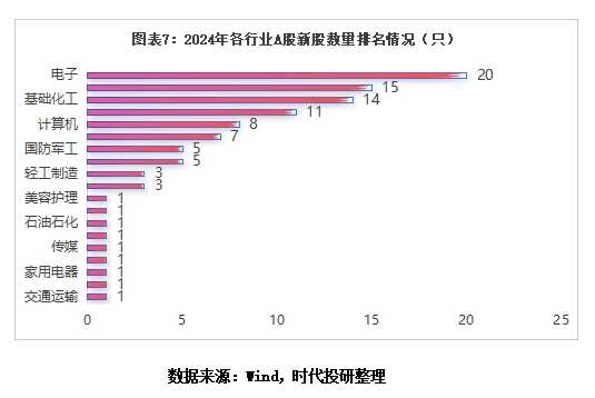 在行业领域,2024年A股仅有20个行业有IPO融资记录,其中电子行业以144.58亿元的融资额独占鳌头,机械设备行业位列第二。从新股数量来看,电子、机械设备、基础化工等行业位居前列。