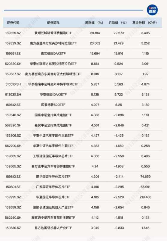 在ETF市场,尽管整体表现低迷,但仍不乏亮点。除了跨境ETF因短线资金追捧而表现抢眼外,本周多个行业赛道也展现出强劲的增长势头。