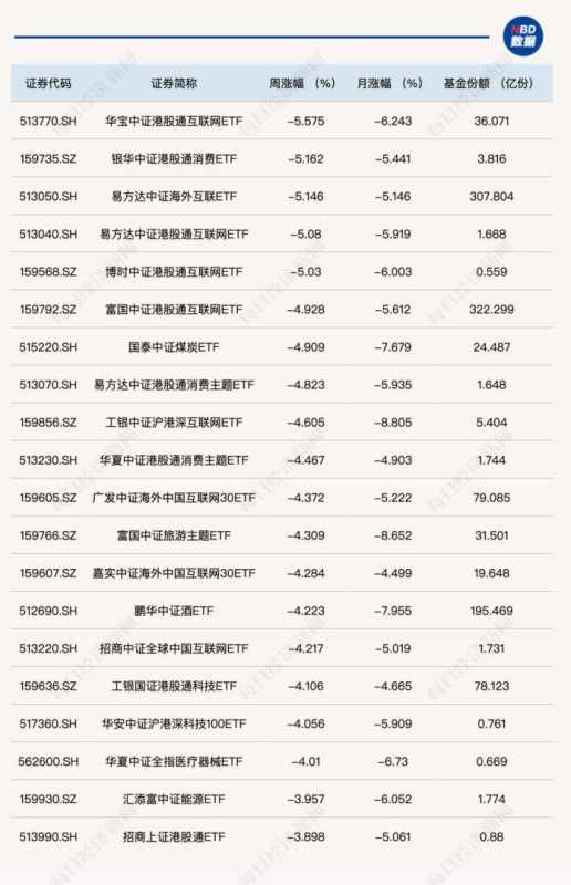 此外,受腾讯控股大幅下跌影响,多只布局港股互联网公司的ETF本周也遭遇大跌。同时,旅游ETF、酒ETF、煤炭ETF和能源ETF等本周跌幅也在4%左右。