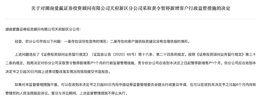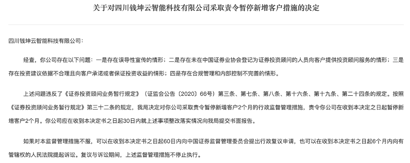 近日,四川证监局对四川钱坤云智能科技有限公司和湖南爱赢证券投资顾问有限公司天府新区分公司两家证券投资咨询机构实施了行政监管措施,责令其暂停新增客户。