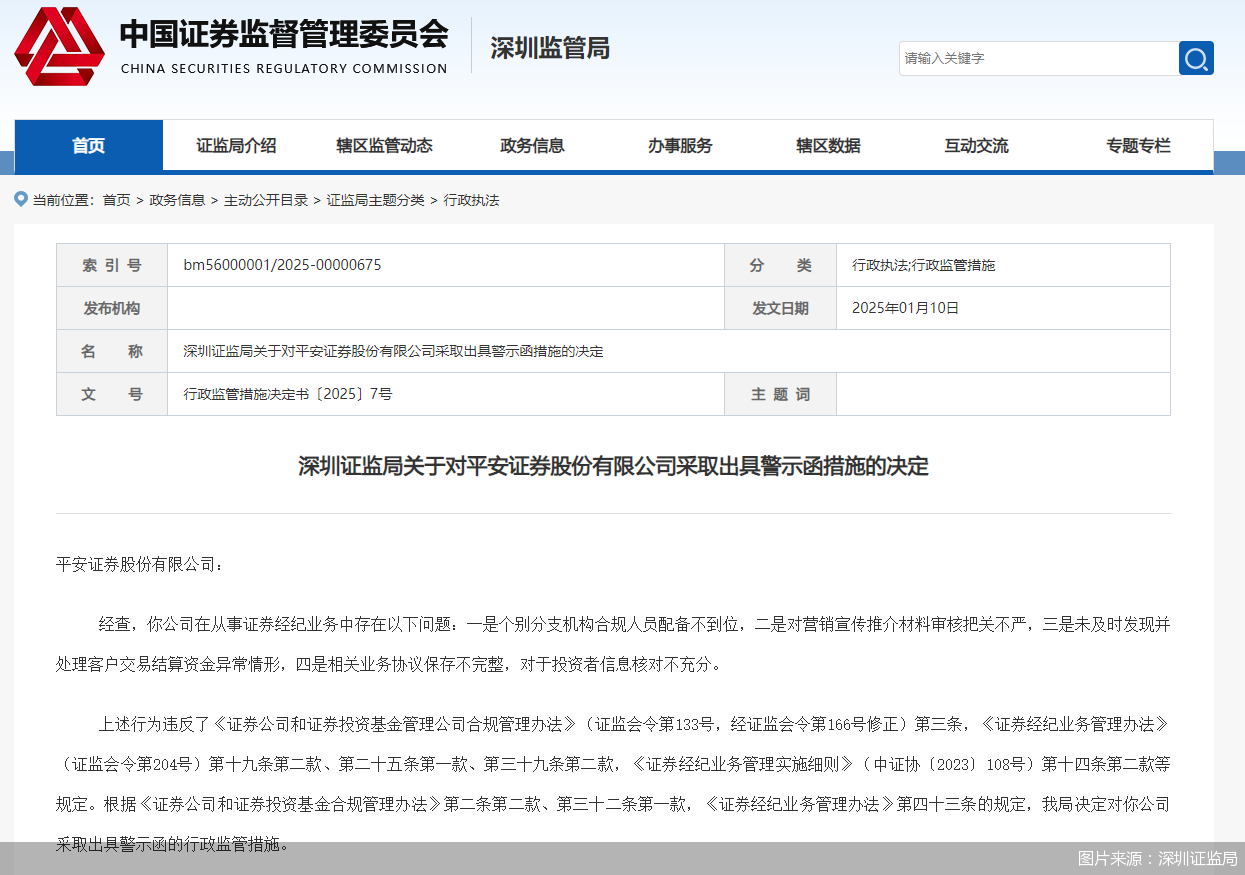 近日,深圳证监局针对平安证券的证券经纪业务发布了监管公告,指出其在合规人员配备、营销宣传材料审核、客户交易结算资金处理及投资者信息核对等方面存在多项问题,决定对其采取出具警示函的行政监管措施。