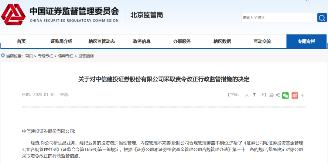 2025年1月10日,北京证监局正式公布了针对中信建投证券股份有限公司的行政监管决定,指出其在衍生品业务和经纪业务中的投资者适当性管理、内控管理体系存在不足。