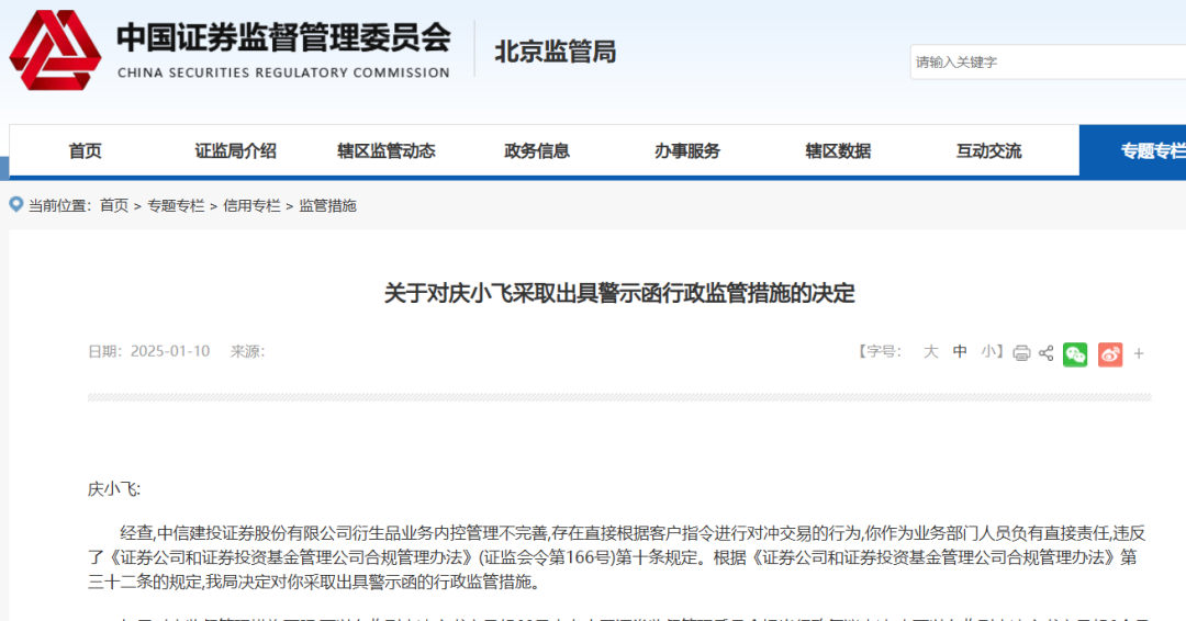 值得注意的是,中信建投证券衍生品业务部门的一名员工庆小飞也因直接参与并执行了基于客户指令的对冲交易行为,被北京证监局出具了警示函的行政监管措施。这一行为同样违反了《证券公司和证券投资基金管理公司合规管理办法》的相关规定。