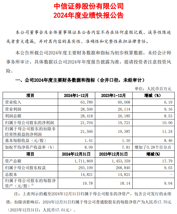 中信证券发布2024年业绩快报,净利润同比增长10.06%