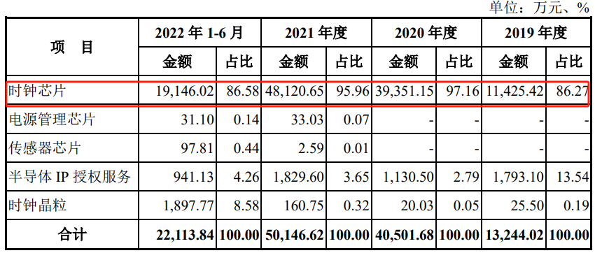 奥拉股份自述“致力于成为领先的平台型模拟集成电路设计企业”,产品线包含时钟芯片、电源管理芯片、传感器芯片、射频芯片四大类。但实际上,公司的产品收入高度依赖时钟芯片,时钟芯片的收入贡献度在报告期内高达86%-97%。