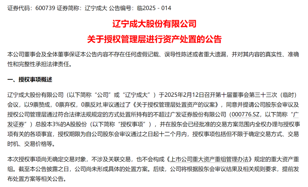 “二号”股东辽宁成大拟处置部分广发证券股份。2月12日晚间,辽宁成大公告披露,当天召开董事会审议通过了《关于授权管理层处置资产的议案》,同意并提请公司股东会审议及授权公司管理层,通过符合法律法规规定的方式处置所持有的不超过广发证券总股本3%的A股股份(以下简称授权事项),并在股东会已经批准的交易方案范围内全权办理与授权事项有关的各项事宜。