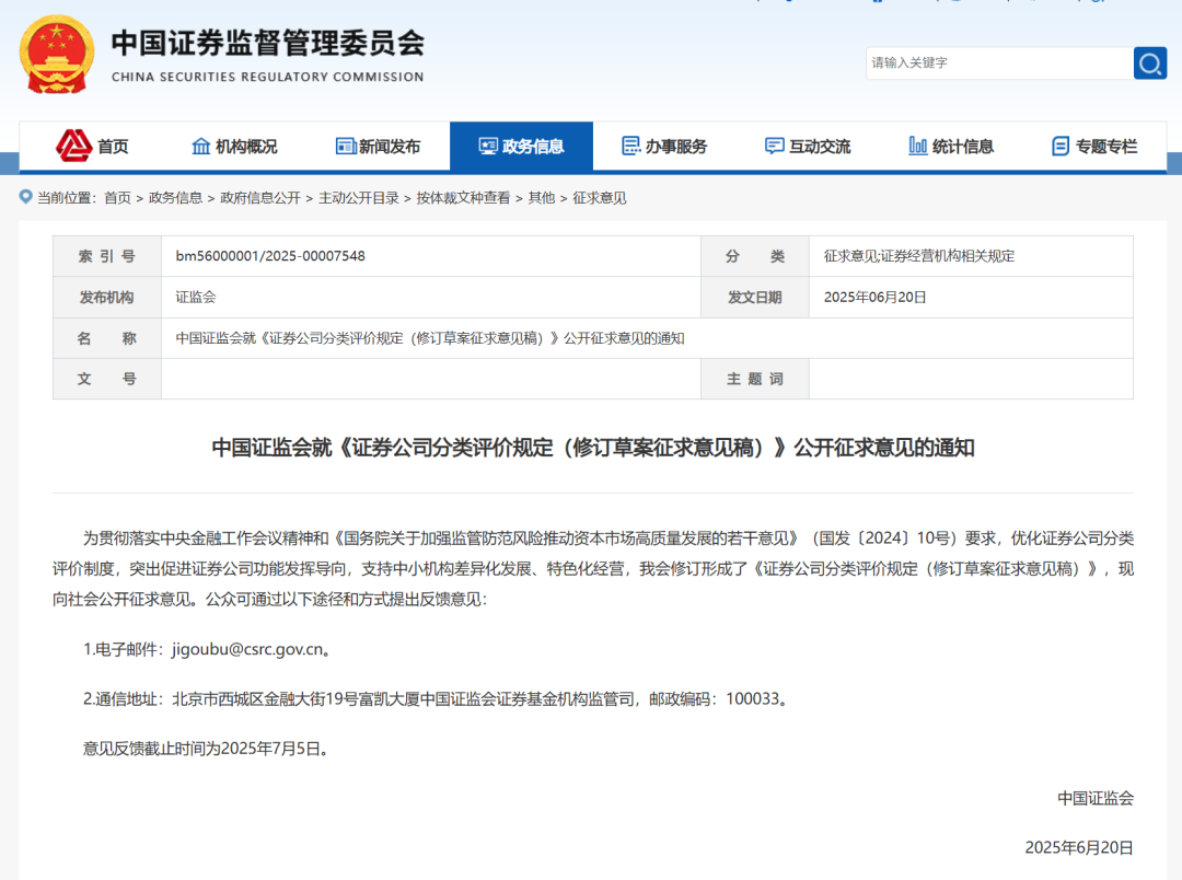 6月20日,证监会于官网发布《证券公司分类评价规定(修订草案征求意见稿)》,意见反馈截止时间为2025年7月5日。