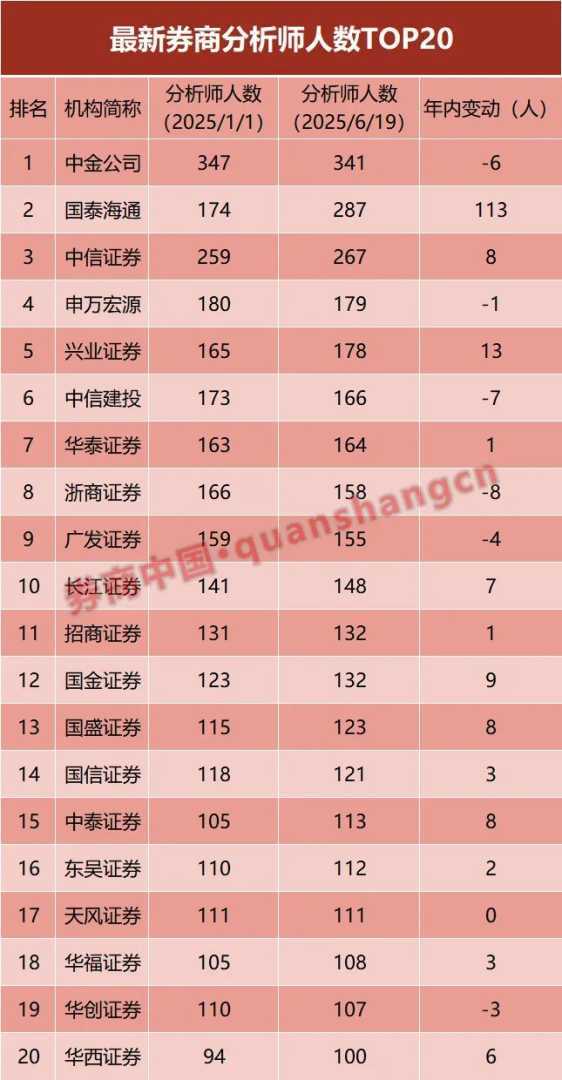 持续扩容的证券分析师队伍,终究告别了高速扩张时代。数据显示,截至6月19日,证券公司分析师总数达5787人,仅较年初增加41人,增幅远逊于往年同期。年内分析师数量变动较大的包括国泰海通证券、国联民生证券,以及正发力卖方研究的东方财富证券等等。