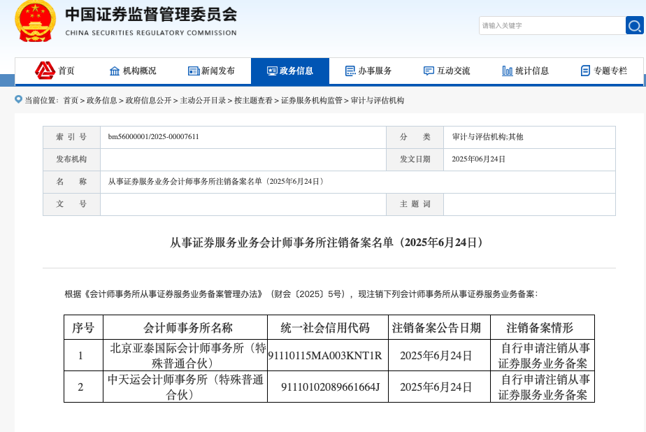 证监会官网显示,6月24日,北京亚泰国际会计师事务所(特殊普通合伙)(以下简称北京亚泰)和中天运会计师事务所(特殊普通合伙)(以下简称中天运)自行申请注销从事证券服务业务备案。