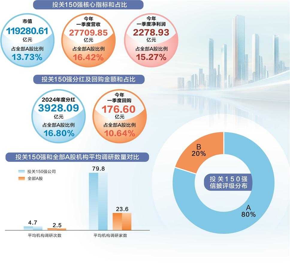 第一,综合实力优异。150家公司总计市值11.93万亿元,占全部A股的比例为13.70%。比亚迪、贵州茅台、国电南瑞等30余家企业市值达千亿以上,大多为各自领域的领军企业。150家公司业绩表现稳健,2025年一季度实现营收2.77万亿元,净利润2278.93亿元,占全部A股比重分别为16.42%、15.27%。