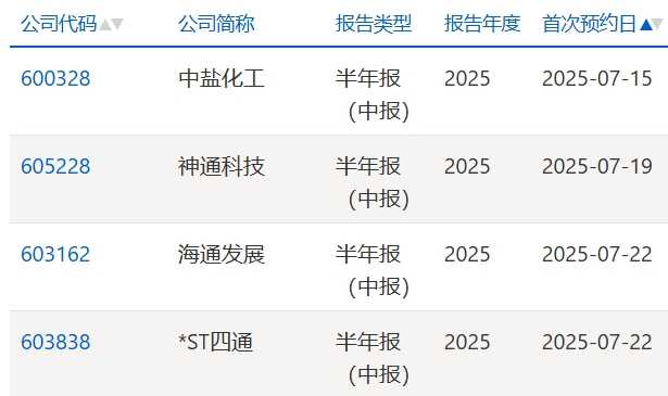 据上交所网站消息,2025年半年报预约披露时间已确定,中盐化工将于7月15日率先披露,神通科技、海通发展、*ST四通等公司也将陆续披露,为投资者提供公司运营情况的时间表。
