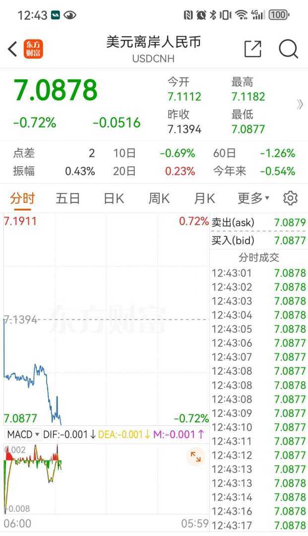 受美元指数走弱的影响,非美货币普遍呈现上涨趋势。11月4日10点30分,离岸人民币兑美元成功突破7.10关口,并在后续交易中继续攀升。截至财联社记者发稿时,离岸人民币兑美元即期汇率大涨516个基点,达到7.0878,连续突破了7.10和7.09两大关键点位,回到了10月15日左右的水平。